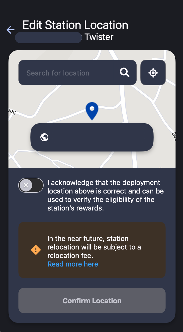 As a result, your station will not be eligible for reward distribution until it is moved back to the declared location or the location is updated by using the "relocate station" function on your mobile app.